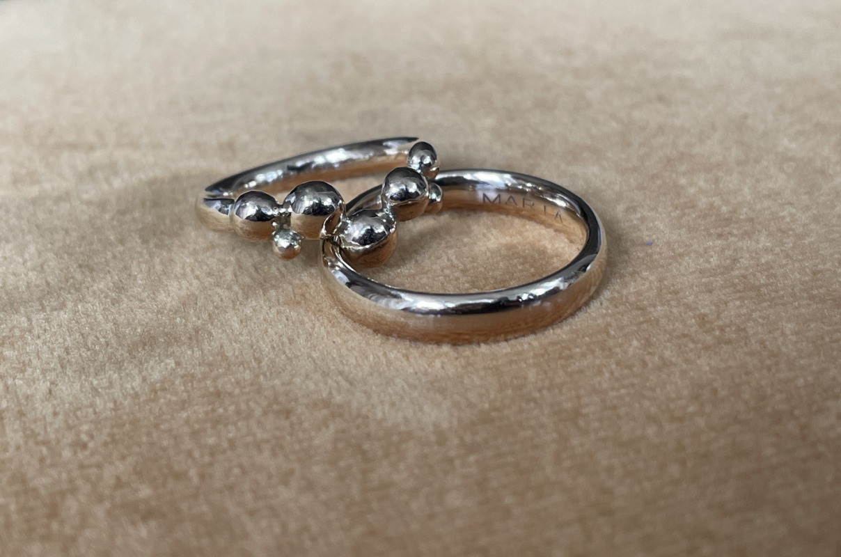 Aurora ringen blev inspirationen til et sæt unikke vielsesringe for Maria og Thor. Hun havde længe søgt efter noget lidt anderledes end de gængse “klassiske” vielsesringe og faldt hurtigt for Aurora ringen. Den på webshoppen er lidt anderledes, da ringskinnen er “rund” og ikke egner sig til gravering, og derfor blev den modificeret lidt, og i stedet for blev ringskinnen oval, så der blev plads til en flot gravering indvendig. Herreringen skulle ligeledes ligne Aurora ringen lidt, og derfor blev den også oval i formen.