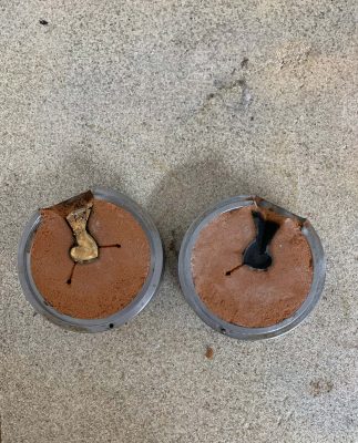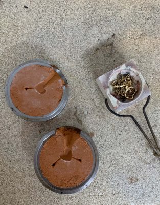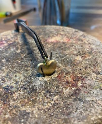 På billederne kan man se nogle af de mange processer, som hjertet har været igennem for at blive til slutresultatet. Det kan blandt andet bemærkes, at hjertet først blev lavet i voks, og så støb af det gamle guld. Herefter blev indløbet smeltet om igen til en tråd, jeg herefter trak ned til 2mm for at kunne lave den tykke del af øsknet. Herefter var der tråd tilbage, som igen blev valset til endnu tyndere tråd for at lave de små tynde ringe, der kun er 1mm tykke. Herimellem er der renovering af alle delene, og til slut en polering af overfladen, så den blev dejlig blank og lækker at røre ved.