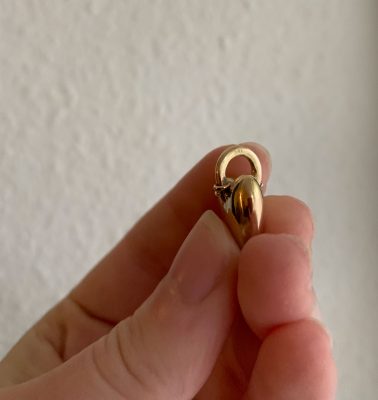 Jeg fik en masse små og store guldsmykker i 14kt guld, som vedhænget skulle laves af. Der var blandt andet et gammelt guldkors, som kunden havde fået af sin afdøde far, som hun ikke havde lyst til at gå med på grund af symbolikken. Derfor havde hun brug for, at den skulle laves om, så hun kunne gå med noget, der stadig var fra ham. Hjertet symboliserer ikke kun mindet om sin elskede far, men også om kærlighed til sig selv og en omfavnelse af livet. (hvis man ser efter detaljerne i øsknet, der forbinder halskæden med smykket /vedhænget, der er formet som et hjerte.
