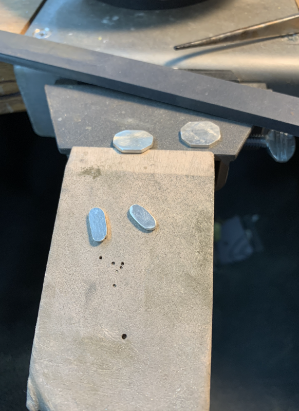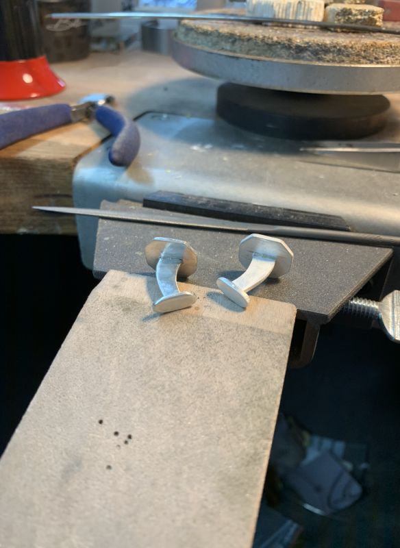 Her er et sæt flotte manchetknapper, jeg har lavet fra bunden. Det hele starter med en idé og en tegning. Derefter besluttede jeg nogle mål ud fra (i det her tilfælde) standard mål for en manchetknap, så den ikke bliver for voldsom eller for lille. Herefter er den blevet skåret ud fra en sølv plade, der er støbt fra genanvendt sterling sølv.